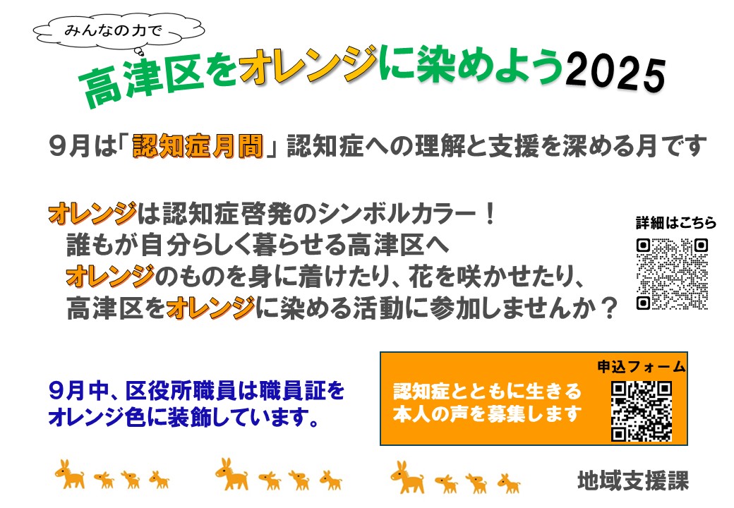 オレンジ色は認知症支援のシンボルカラー。区役所内や区内をオレンジに染める取組です。オレンジ色を身に着けた写真を募集します。いただいた写真は9月14日から9月30日まで区役所1階市民ホールにパネル展示予定です。