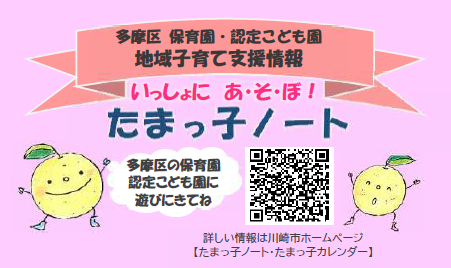 「たまっ子ノート」は、多摩区の保育園・認定こども園で実施している地域子育て支援の情報を掲載しています。子育てに関する講座・遊びの会や園庭開放・室内開放・絵本貸出などが行われています。是非お近くの園へ遊びに行ってみてくださいね!
