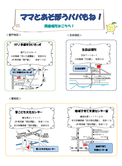 多摩区公私立認可保育園が主催し、こども文化センターや主任児童委員さん民生委員児童委員さんの協力を得て、就学前のお子さんとその保護者の方の集いの場として開催しています。