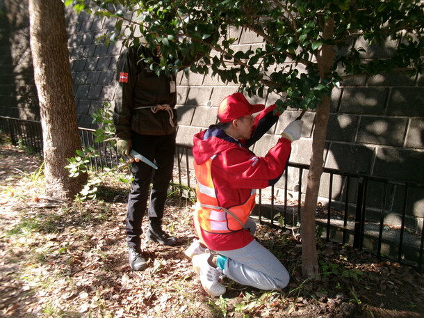 当日は管理運営協議会のメンバー4名が参加し、講師の公益財団法人川崎市公園緑地協会職員から低木の剪定方法やひこばえの除去の仕方、下枝の落とし方などを学び実践し、中高木は、胴ぶきやひこばえを取り除き、大きくなった低木の高さを整え、不要な枝を取り除いてすっきりとした姿になりました。